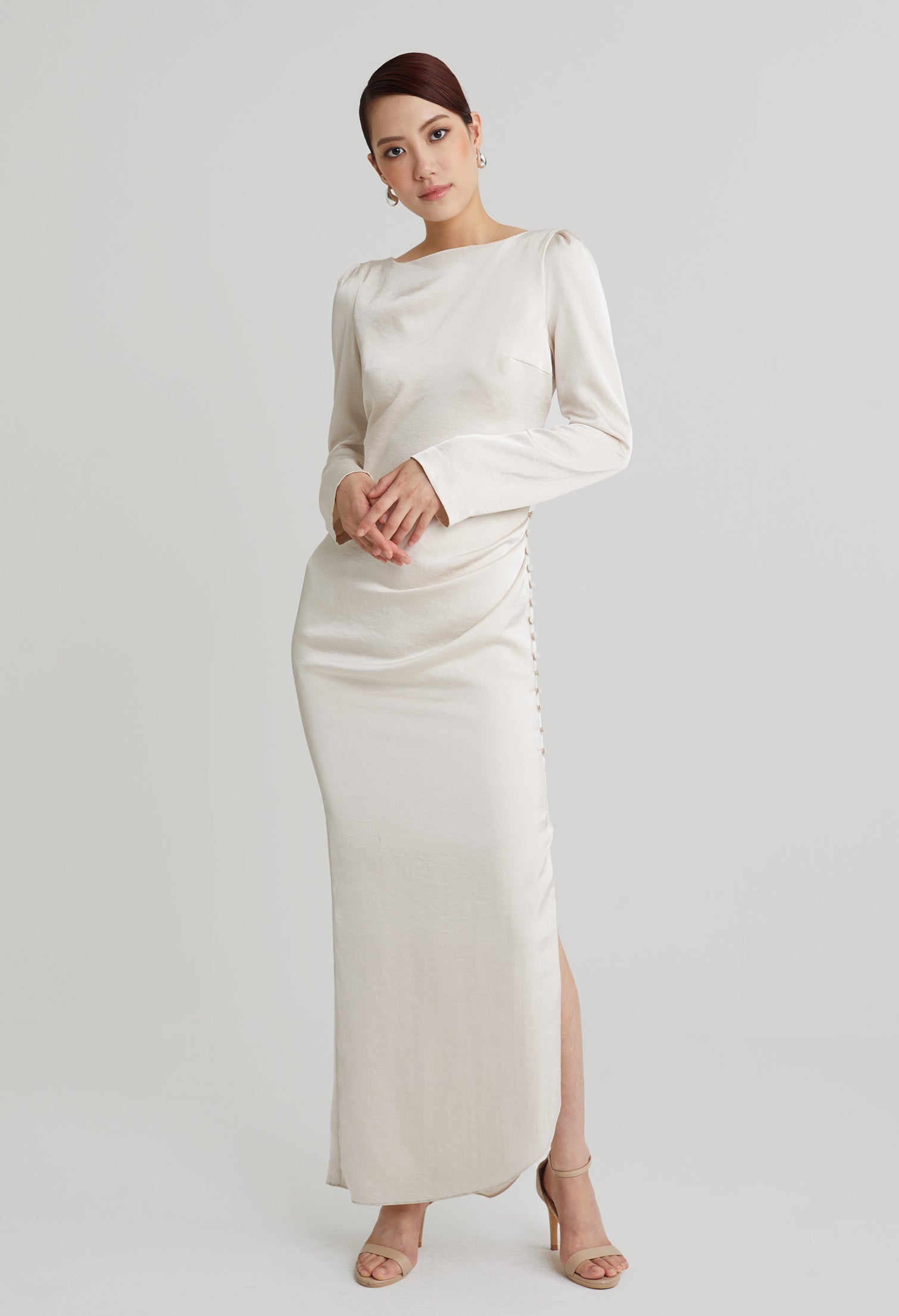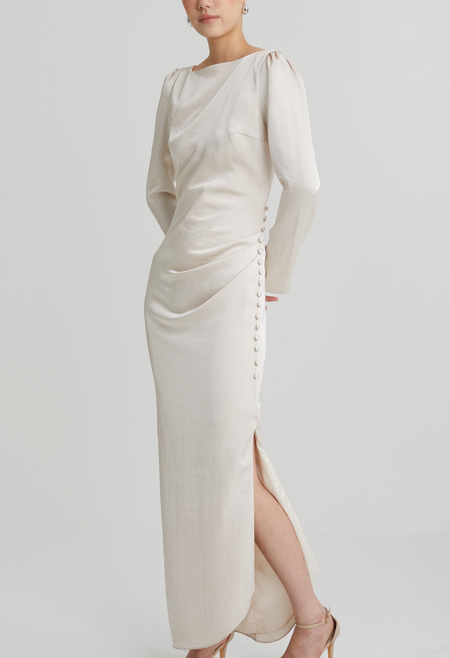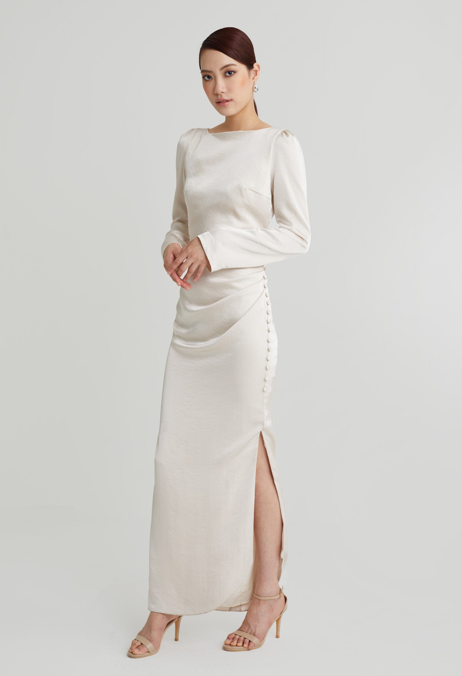 nichii X NURITA HARITH Draped 3-Button Cuff Sleeves Maxi Dress 653,900 Ks Original price was: 653,900 Ks.457,730 KsCurrent price is: 457,730 Ks.